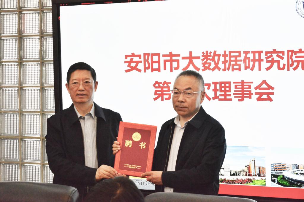 会议审议通过了理事会章程、理事会成员名单、学术委员会成员名单,校长景国勋当选第一届理事会理事长。会议还宣布了研究院院长、副院长人选。计算机学院副院长孙高飞被聘为研究院院长,安阳市大数据局副局长靳水成和计算机学院教师许研、韩毅被聘为研究院副院长。景国勋先后为理事会成员、学术委员会成员、院长、副院长颁发聘书。随后,与会人员围绕研究院下一步的工作安排进行了讨论交流。