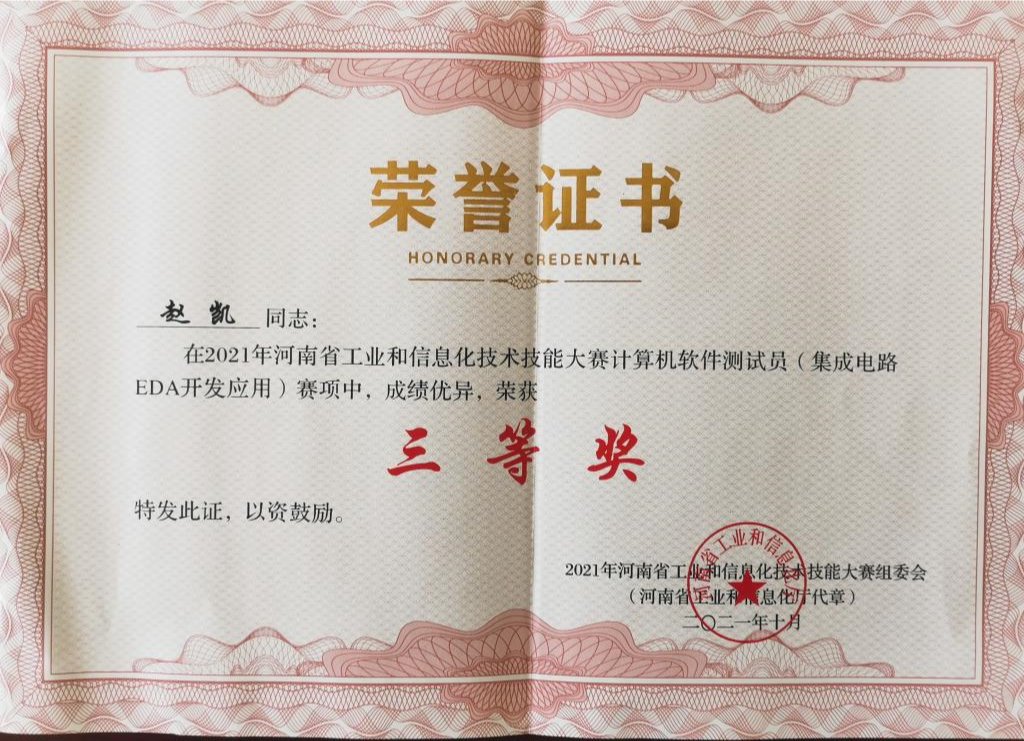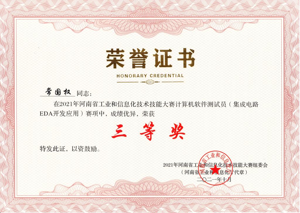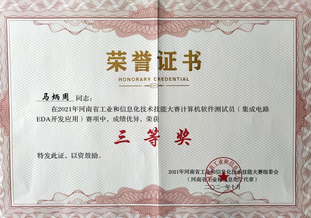 由省工业和信息化厅、省人力资源和社会保障局、省教育厅、省总工会、团省委联合举办的2021年河南省工业和信息化技术技能大赛,在各承办单位、参赛企业和院校的共同努力下,取得了圆满成功。来自全省大中专院校和企业共57家单位、110支队伍、253名选手参加了比赛。经过紧张激烈的角逐,我校yl9193永利集团体系结构教研室常国权、马炳周、赵凯组成的教师代表队获得计算机软件测试员(集成电路EDA应用开发)三等奖。