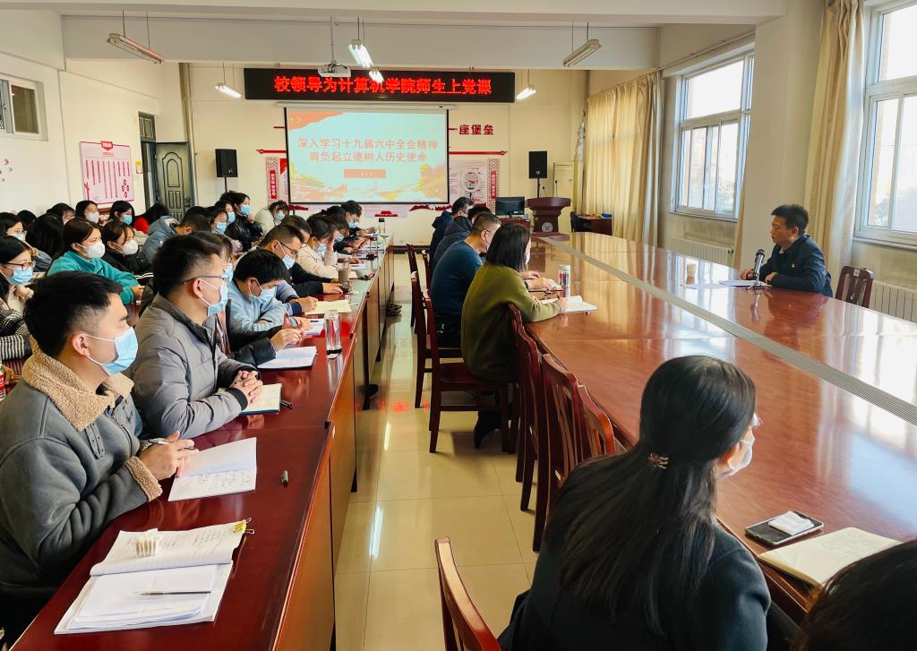 11月24日下午,副校长蒋文龙以《深入学习党的十九届六中全会精神 肩负起立德树人光荣使命》为题,为计算机学院80多名师生党员讲党课。